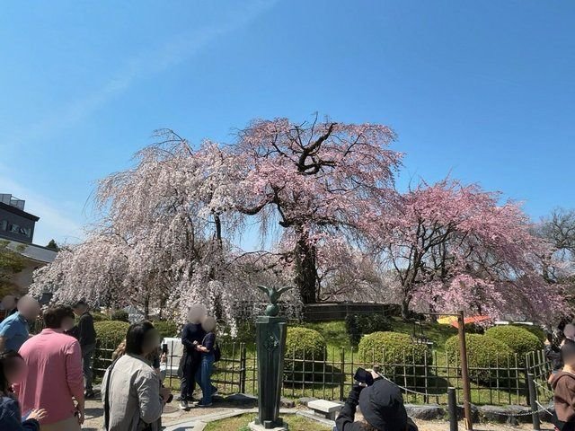 樹齢200年余の初代枝垂桜が昭和22年に枯死。その初代の種子から大事に育てられた桜が、現在の2代目。ところどころ接木した部分が見受けられ、さらに品種が違うようで色の濃淡も楽しめる、パッチワークのように共存し、見る角度によっても趣きが違う枝垂れ桜。。夜にはライトアップされ、昼間の風情とは違う幽玄さ。
