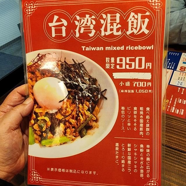 で、暫しの後ババーンと登場、「台湾混飯」¥950なり。豚ピリ辛系粗びき豚ミンチ(甘醤油系な煮込み)を、魚粉、刻みニラ、刻み海苔、それに温玉!と合わせてマゼマゼして頂く趣向。台湾混ぜそばのご飯版!のような感じ。劇濃ゆい味付けでは無く、辛味も含め協調、程良いのが美点ですな。底から混ぜ返して・・