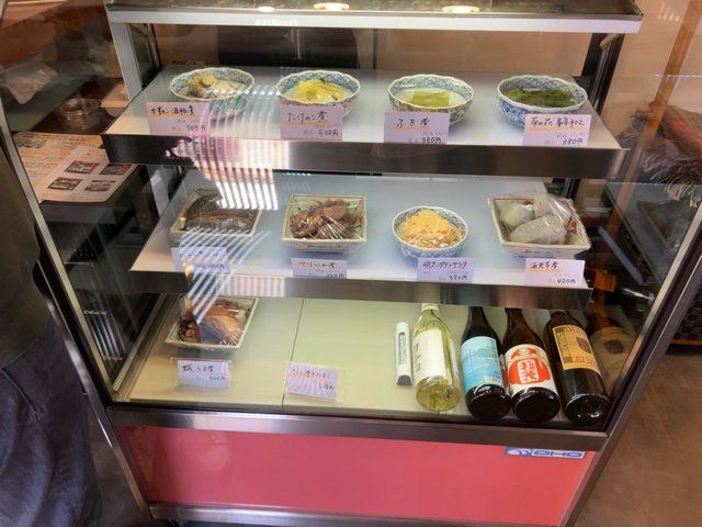 店内入ってスグの場所にショーケースがあり、旬の地元食材を使った持ち帰り用のお惣菜も販売されています。この日も地元の方が買いに来られていて人気の様子。この時期は地元牡蛎を使ったカキフライやヤリイカ煮、ホタルイカ煮なども。