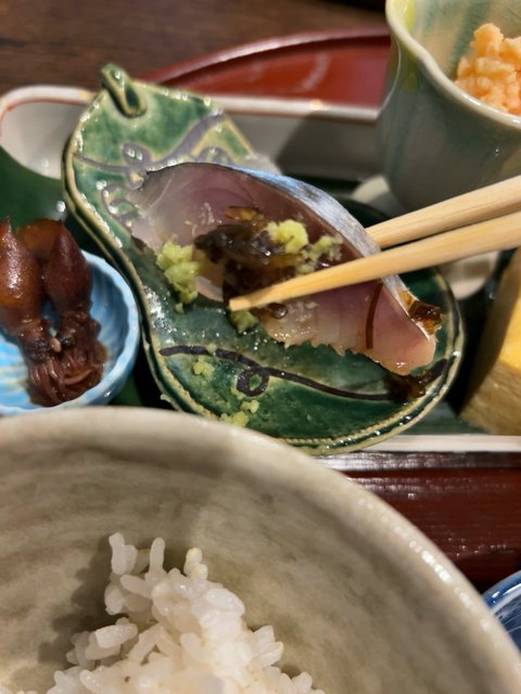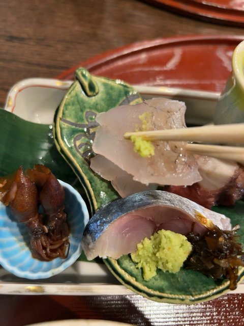 お造りには醤油でなく、本わさびの横に添えられた自家製昆布佃煮を乗せて食べてください、とのこと。生もの、〆もの、煮ものありで、いろんな料理法の魚介がいただけます。