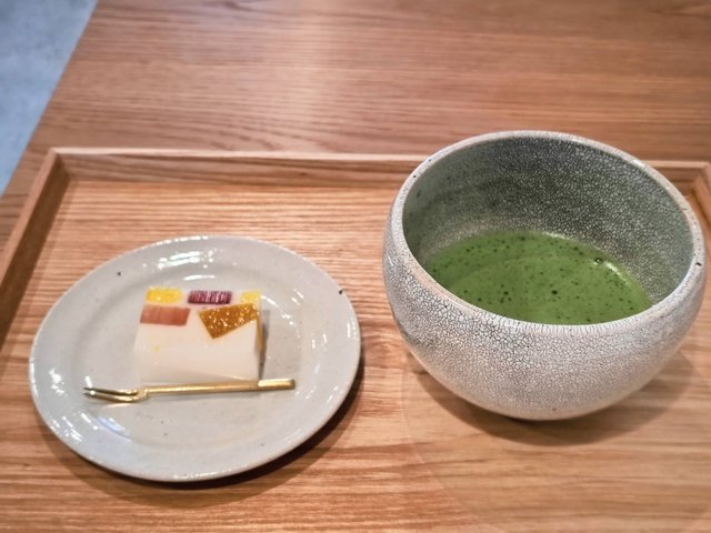ほぼ貸し切りの贅沢な席でいただいたのは、抹茶とフルーツ羊羹のセットです。