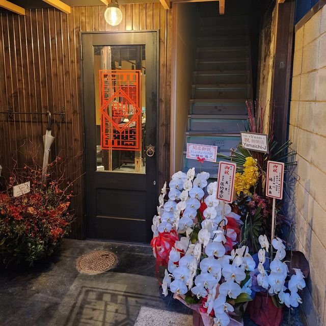 で、会館の入口から入って、1Fの一番奥に今回予約した「四川料理と酒 Yuan」があります。1月21日にオープンしたばかりで、沢山のお祝いの花を眺めつつ店内に。