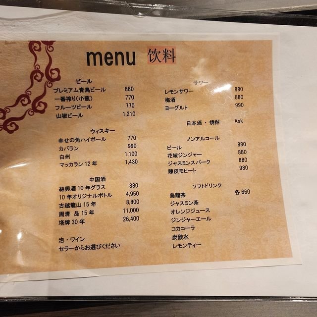 ワタシはあまり出会わないもの!ということで「プレミアム青島ビール(小)」¥880、相方は「麒麟一番搾り(小)」¥770を呑みつつ、お料理メニューをしげしげと確認。