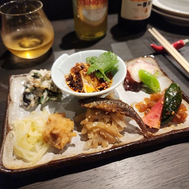 キッチン前にカウンター席が6席、入り口側に4人テーブルが2つ、奥に個室があるようで5席と言うこじんまり店。男前ご店主、それにお若いサービス陣2名の3名編成で運営中。30分少々で奥の個室も含めて概ね満席状態でした。既に人気なのだ。