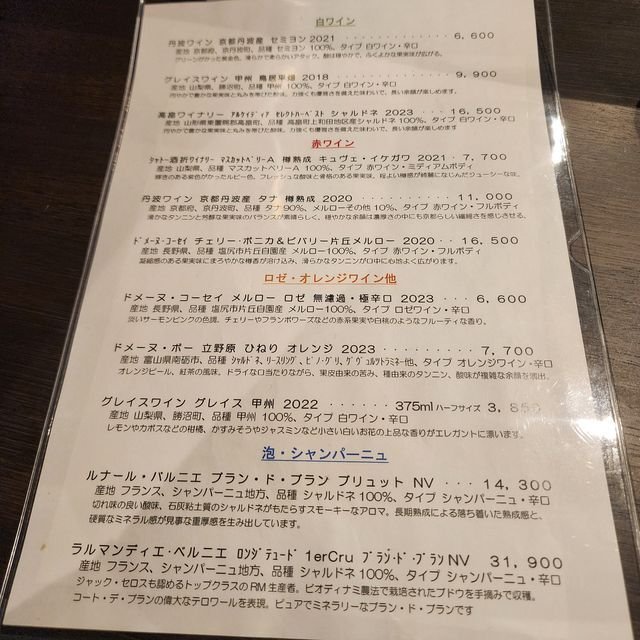 これはお料理に何を合わせて呑むと幸せか悩むのですが、ワインリストがこちら。国産ワイン推し!なのがまたまた面白いですな。そこそこ良いお値段ですが、せっかくの旨い中華なのでお酒も奮発するか!ということになりまして・・・・・・