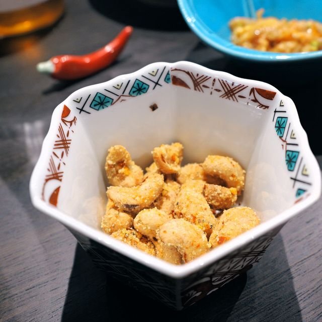 途中でサービス担当のお兄さんから「お時間かかりますので、サービスです!」と、こちらのカシューナッツを。メニュー外の注文外なのですが、これが滅茶ウマ。刻んだココナッツでコーティングされていて軽やかに甘く、かじるとピリッと!と言う仕掛け。過去食った豆類のアテの中でも超ハイレベル! こりゃ、メニューに入れたほうが良い奴です。