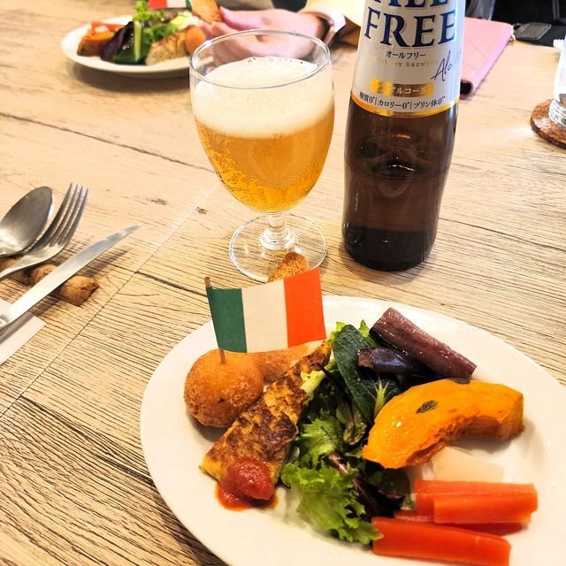 で、まずは前菜盛り合わせが登場。旗が立ってる丸いコロッケはチーズ入りのパン?のような感じ。イタリア風卵焼きのフリッタータ。野菜類も抜かりなく美味しいわけで。こりゃワインを!なのですが、2人とも自転車で移動中なので、我慢してノンアルビール!ということに。