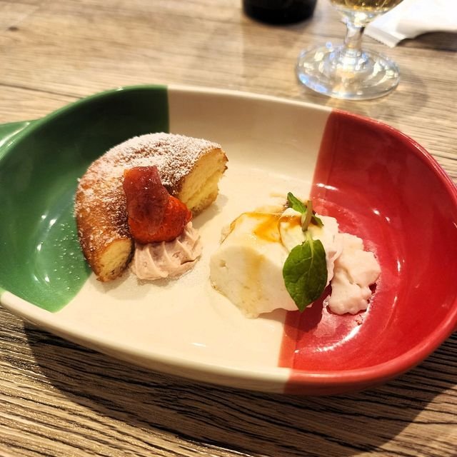 左手は先ほどのふわふわ揚げドーナッツ半分に苺と自家製苺ソースを掛けました!的な一品で、左はパンナコッタというかミルクムース的な一品でこちらも少量ですが、ニッコリ!なわけで。