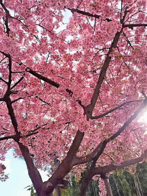 空が見えないくらいの密度で咲いている河津桜。