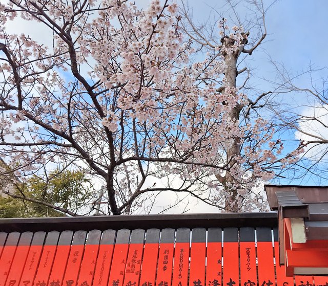 玉垣の朱色と青空、その間の桜という取り合わせは完ぺき!
