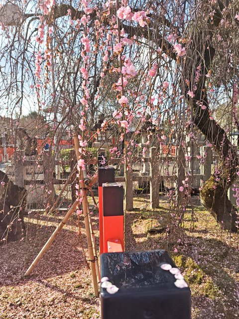 本殿に向かう大鳥居の脇にはしだれ梅がありますが、私が訪れたときにはすでに散り始め。