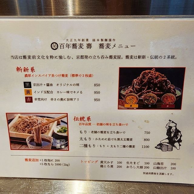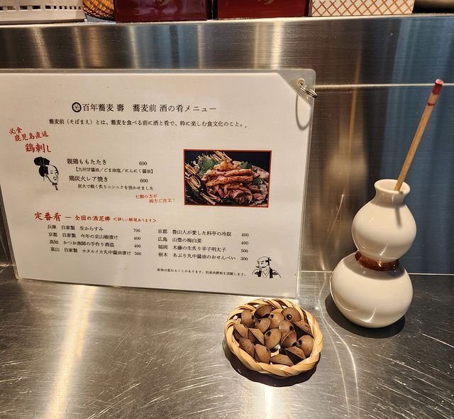 お店の名前は「百年蕎麦 壽」。立ち飲み日本酒バー兼立ち食い蕎麦屋、という、京都市内ではあまり類を見ないスタイルのお店。暖簾の間から覗くと、カウンターに隙間がありそうなので入れてもらうことに。