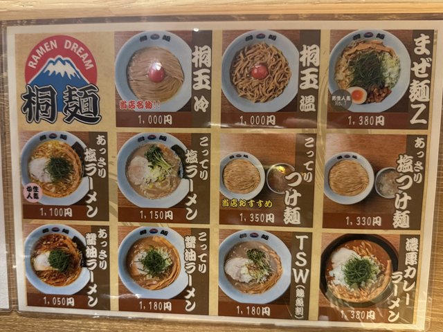 桐麺といえば桐玉のイメージが強いですが、実はメニューはかなり多彩。まぜそば、あっさり塩、こってり塩、あっさり塩つけ麺、あっさり醤油、こってり醤油、TSW(鶏魚割)、濃厚カレーラーメンまで揃います。