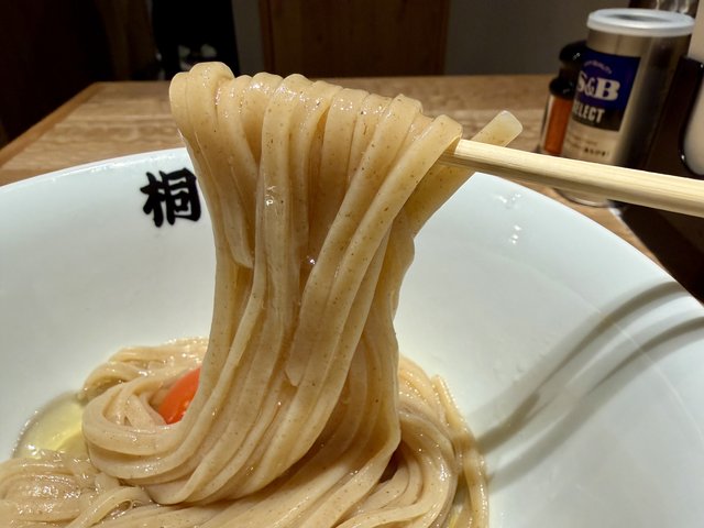 桐麺といえば、やはり名物「桐玉(温・冷 1000円)」。オリジナルブレンドの、もちもち食感の平打ちストレート太麺の魅力を全面に押し出した一杯です。