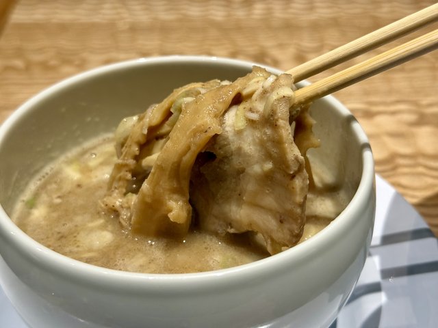 こちらは豚バラチャーシュー、穂先メンマ、ねぎ、玉ねぎ入り。鶏豚骨を長時間炊いたつけ汁は、旨味もコラーゲン感もたっぷりで濃厚。それでいて過度な粘度はなく、食べやすく仕上げられています。