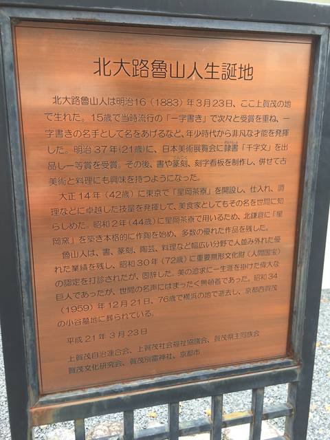 グルメ漫画『美味しんぼ』のモデルにもなったと言われる陶芸家、美食家の北大路魯山人。上賀茂神社の社家の生まれということで有名で、その生誕地には石碑もあります。社家出身ということで、比較的裕福ない家柄に育った人物的イメージですが、実際には激動の半生を過ごします。