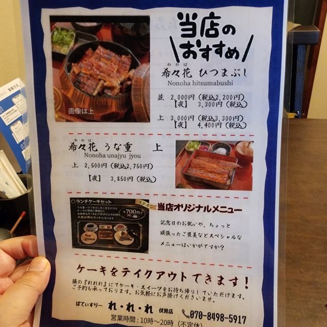 お店の名前は「うな希゛希々花(ののは) 伏見店」。お隣は阪急西向駅から南東に徒歩10分ほど、一文橋から東に250mほどにある「パティスリー れ・れ・れ」の支店なのですが、れ・れ・れ伏見店が、お隣の鰻店の営業母体でもあるようです。