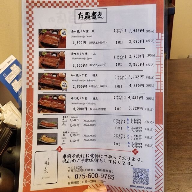 で、メニューを確認。この鰻店もチェーン形式で、本店は大阪中百舌鳥にある国産鰻をお手頃価格て提供している人気のお店。こちら伏見店でも、ランチ時はひつまむし上が税込み¥3300で頂けるお店なのですが、夜は¥4400とぐぐーんとアップ。ランチ鰻重は上が¥2750という今どき相当嬉しい価格設定。