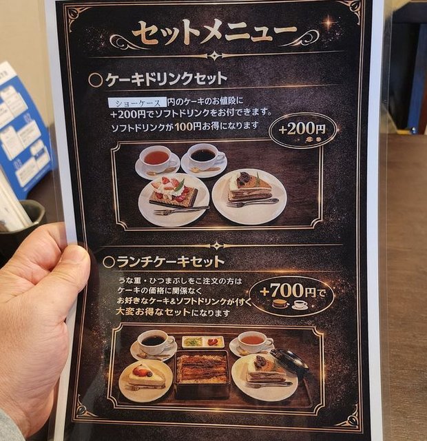 なにせ、ケーキ屋さん併設店。なんとなんと鰻店にも関わらず、こういうケーキセットが注文できる仕組み。それもめっちゃお手頃価格。これは試しに1つランチケーキセットの注文をお願いするわけで。 で、ケーキはどうやって選ばせてもらえるのかな?と思ったら・・・