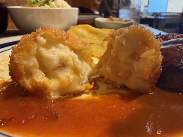 海老クリームコロッケは大きめで、こちらも満足感あり。濃厚なホワイトソースは万人受けする美味しさで、トマトソースがベストマッチ。クリームコロッケの甘みを引き立ててくれます。