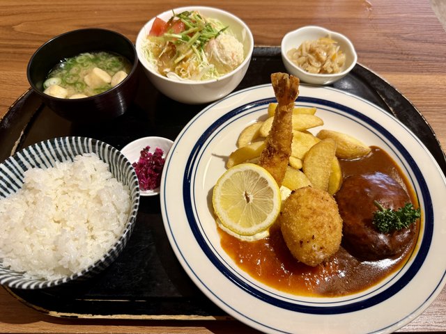 メインプレートは端正な佇まい。自慢のハンバーグに、大きな海老クリームコロッケ、そそり立つ海老フライ。