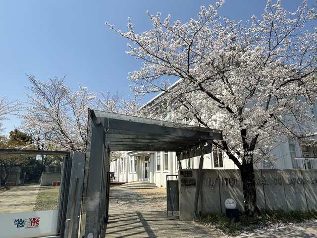 施設内には桜が咲き誇り、訪れた日は青空のもと、まさに満開でした。