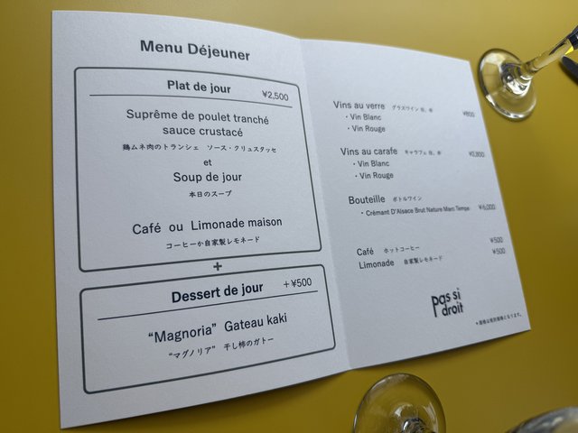 ランチタイムは別ブランド「pas si droit(パ・シ・ドロワ)」として展開。「ドロワじゃないよ」という意味で、2,500円のショートコース一本という使いやすい価格帯。今回は事前に予約して訪問しました。