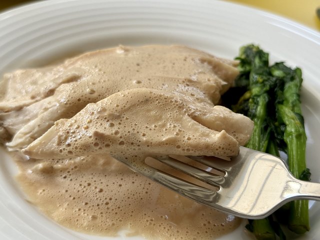 淡白な鶏むね肉だからこそ、香り高い甲殻類のソースが引き立ちます。クリーミーながら軽やかな仕上がりで、菜の花のほろ苦さと食感が良いアクセントに。