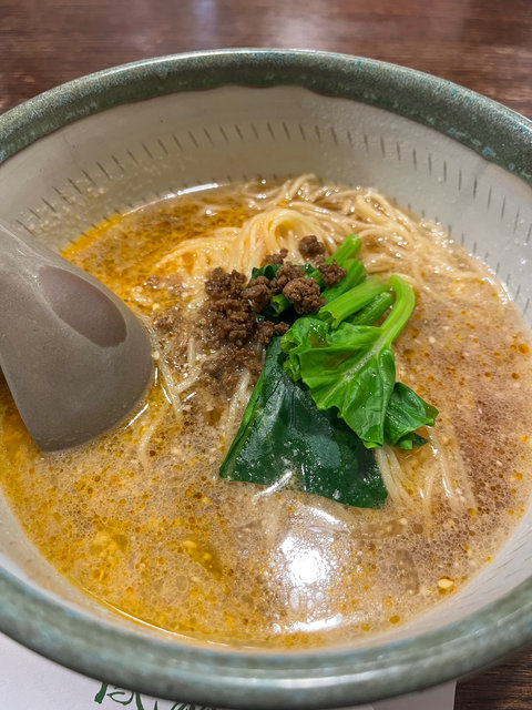 一般的な担々麺のような真っ赤なスープではなく、胡麻の色をしたやさしい色合いのスープに、青菜と肉味噌がのったとても上品な見た目です。京都らしさを感じます。