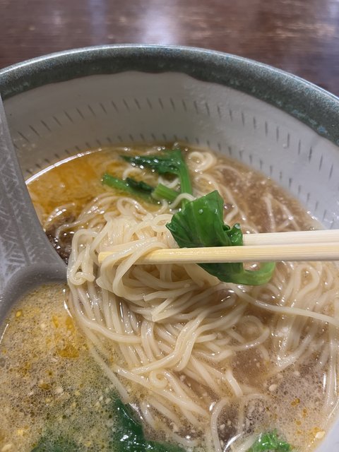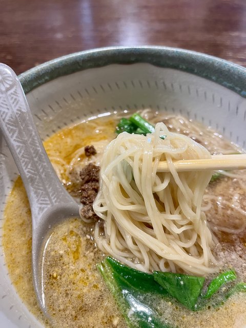麺は細めのストレート麺。なめらかな胡麻スープがよく絡み、するすると食べられます。まさに優しくて上品な味わい、、、