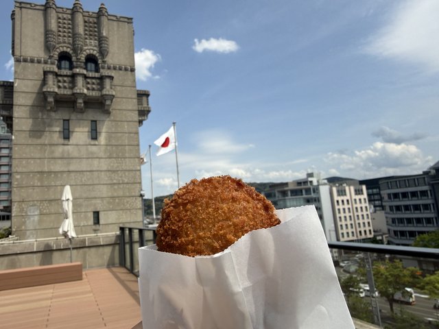 店内にはフライヤーも設置され、揚げたてのコロッケやミンチカツも購入できます。市役所内のオープンスペースや屋上庭園で楽しむのもよさそうです。