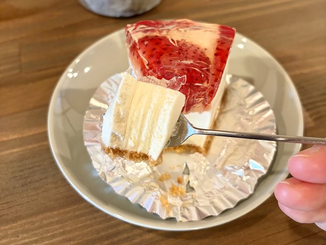 チーズケーキが運ばれてきた瞬間、思わず「かわいい」と声が出てしまいました。お皿の上にちょこんと佇む姿が愛らしくて、さっきショーケースで見ていたときとはまた違う表情に見えました。盛り付けはシンプルなのに、素材の色や質感が引き立っていて、フォークを入れる前から期待が高まります!