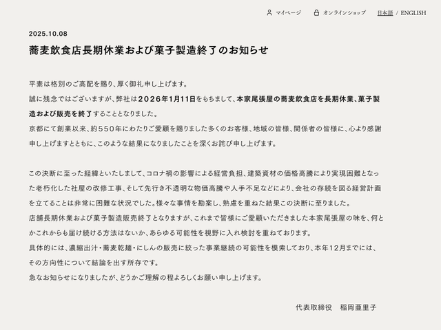 京都・二条の地で長く親しまれてきた老舗そば店「本家尾張屋」。創業は応仁の乱の前年・寛正6年(1465年)。このたび、2026年1月11日をもって長期休業に入ることが公式サイトで発表されました。屋号は残りますが、店舗も売却予定で、実質の閉店となります。