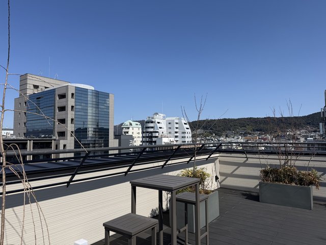 屋上テラスに上がると、視界が一気に開けます。京都の町並みを一望でき、遠くには清水寺の姿も。南側には京都タワー。高層ビルに遮られない空の広さは、やはり京都ならではの贅沢です。