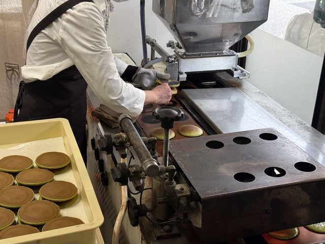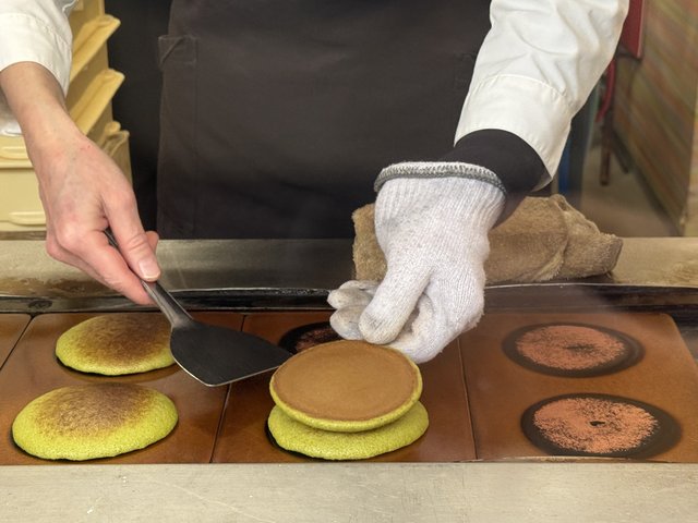 今回は特別に作業現場を見学させていただきました。現在、6種類のフレーバーが用意されており、この日は抹茶どら焼きを製造中。生地が焼き上がる香りが、なんとも食欲をそそります。