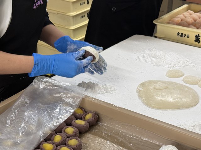 続いて、団子の肝となる包餡の作業を見学。職人の手で、手際よく、かつ丁寧に仕上げられていく様子はまさに職人技です。
