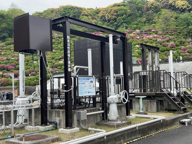 琵琶湖側から浄水処理施設が並び、粉末活性炭接触池→急速撹拌池→ちんでん池→急速濾過池で順番に浄水処理を行います。