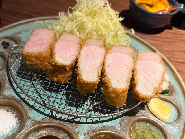 厳選された銘柄豚を、部位やサイズごとに選んで楽しめます。最大の特徴は、低温と高温の油を使い分け、20〜30分かけてじっくりと火を入れる贅沢な調理法。低温で丁寧に揚げられたとんかつは、白く上品な衣がサクサクと軽く、肉質は驚くほどジューシーで柔らか。さっぱりとした脂の甘みと肉本来の旨味が際立ちます。調味料も多彩で、味わいの変化も楽しめます。
