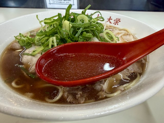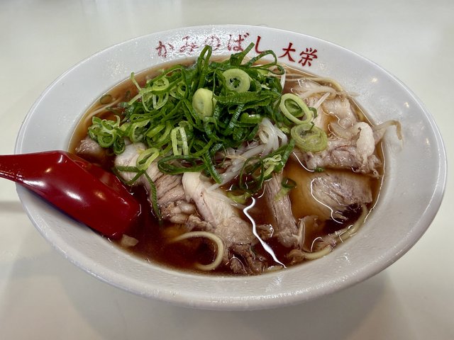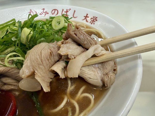 チャーシューは他の大栄系と比べるとやや控えめながら、それでも十分な量。鮮やかな九条ねぎが彩りを添えます。