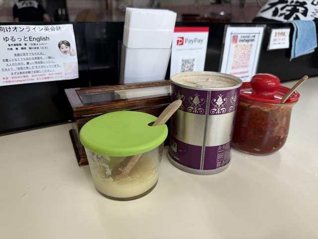 卓上には、おろしニンニク、コショウ、ヤンニンなどの定番調味料。ヤンニンを加えるとコクが増すのでおすすめ。