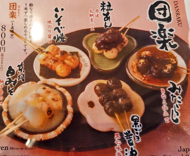 鈴なり団子には、京風白みそ・みたらしきなこ・粒あん・黒ごま醤油・いそべ焼の5種類があり、「団楽(だんらく)」というメニューならすべてが味わえます。