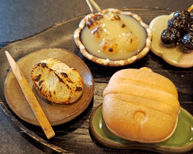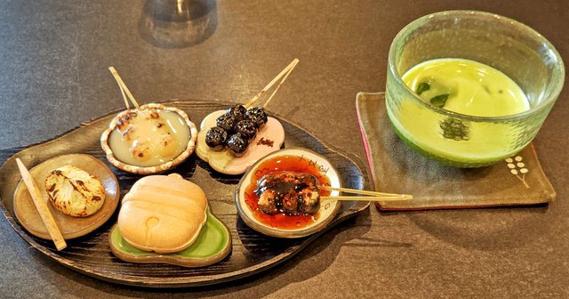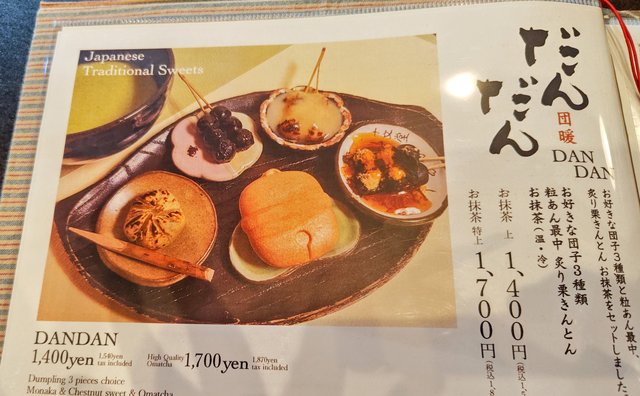 でも私はもう一つ気になるメニューがあったので、好きな鈴なり団子3種類と粒あん最中、それに炙り栗きんとんとお抹茶がセットになった「だんだん」というメニューを注文しました。