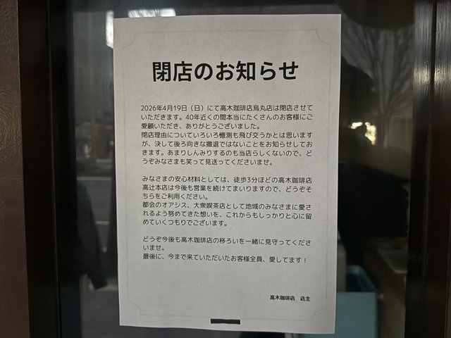 そんな「高木珈琲店 烏丸店」ですが、残念ながら2026年4月19日での閉店が発表されました。