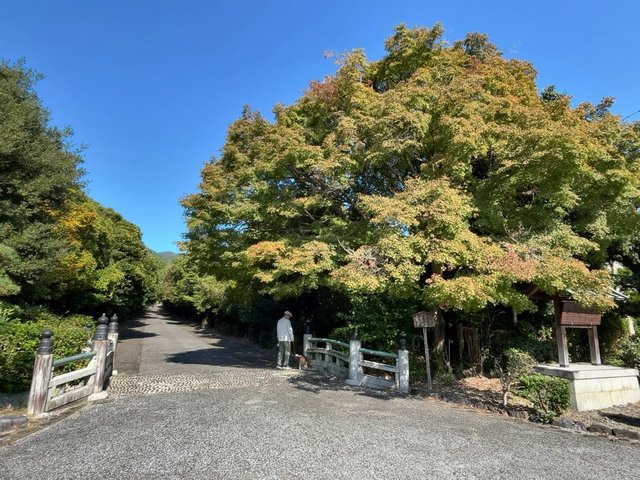 山科・地下鉄御陵(みささぎ)駅から三条通を東へ行った場所にある、京都市内一の規模誇る原生林有する大化の改新、天智天皇(中大兄皇子)のお墓『天智天皇山科陵』。古墳ファンにも興味深いスポットで、墳丘は上円下方墳、上円部は他にはあまり類を見ない截頭八角錐(せっとうはっかくすい)。墳丘周辺は杉や松の木が多いものの、参道にわずかながらカエデの木があり、ひっそりと紅葉を楽しめる穴場。現時点ではグラデーションの序盤。