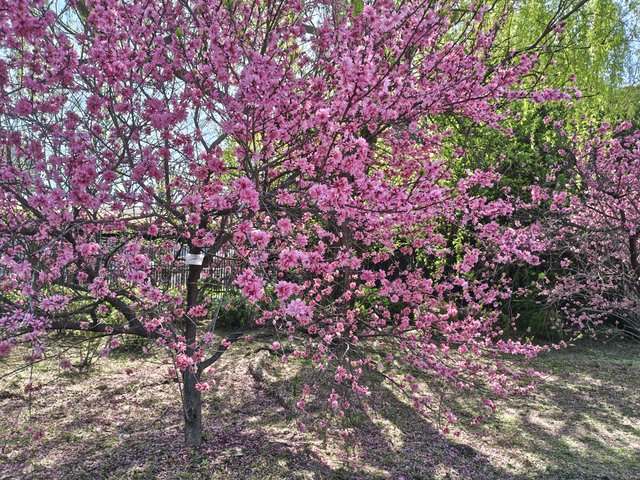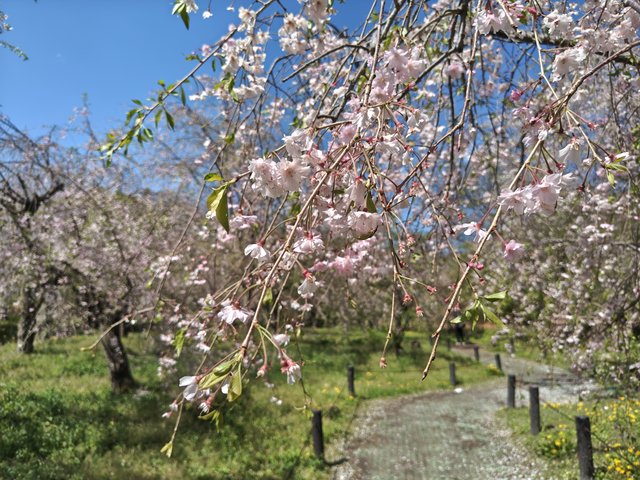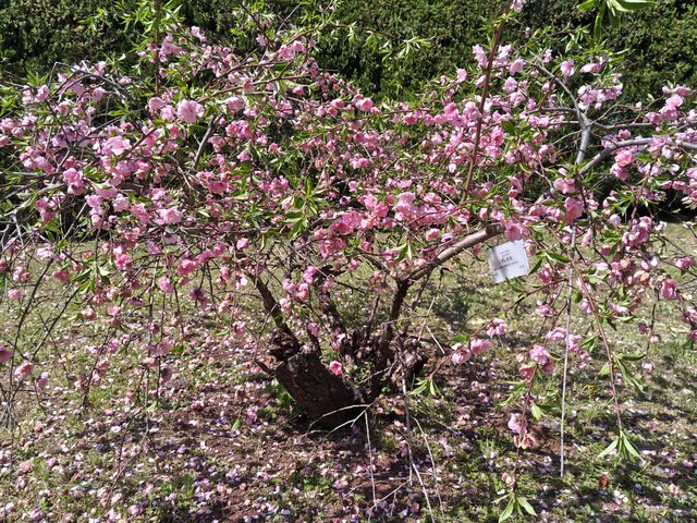 広い通路の東側には遅咲きの桜やハナモモが見頃。