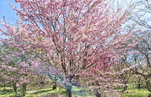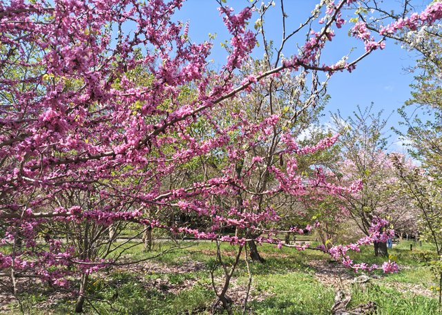 枝から直接花が咲いているように見える不思議な木「ハナズオウ」や藤色がきれいな「フジモドキ」なども桜と一緒に楽しめました。