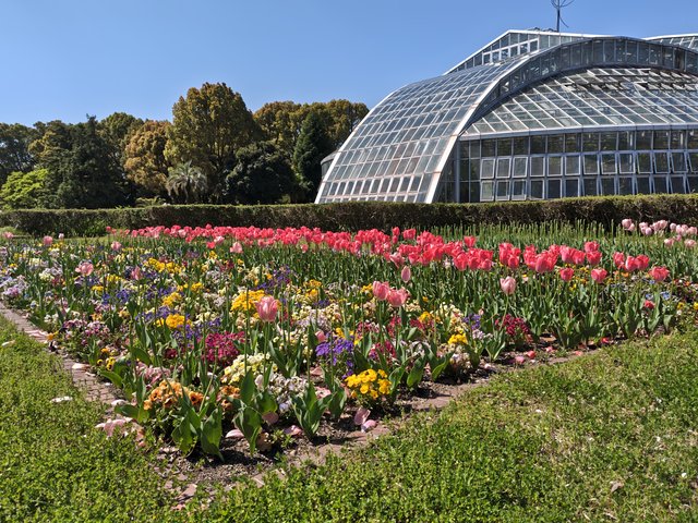 観覧温室の前には色とりどりのチューリップが咲きそろってとても華やかです。