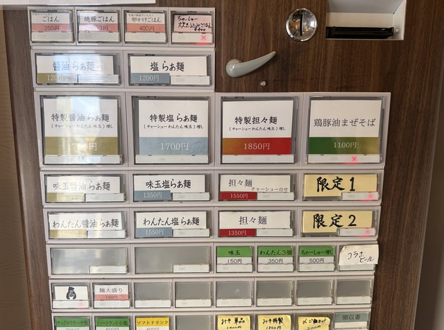 定番は、醤油らぁ麺・塩らぁ麺・担々麺の3種類。この日は限定で味噌らぁ麺も用意されていました。焼き豚ご飯や玉子かけご飯といったご飯ものも揃っています。