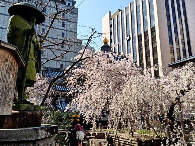 特徴的な六角の屋根と宝珠に桜、背景のビルまでが美しい景色と一体化していました。