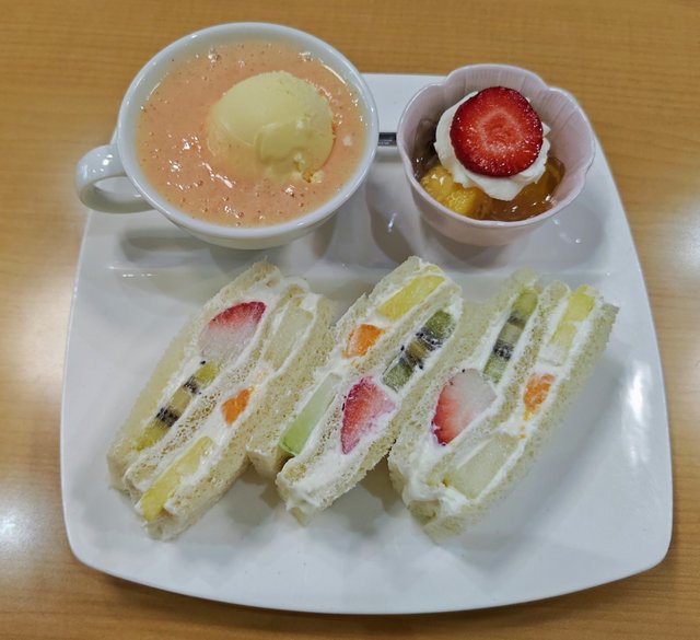 注文したのはフルーツサンドとミックスジュースフロート、それに季節のゼリーがセットになったレディースセット!